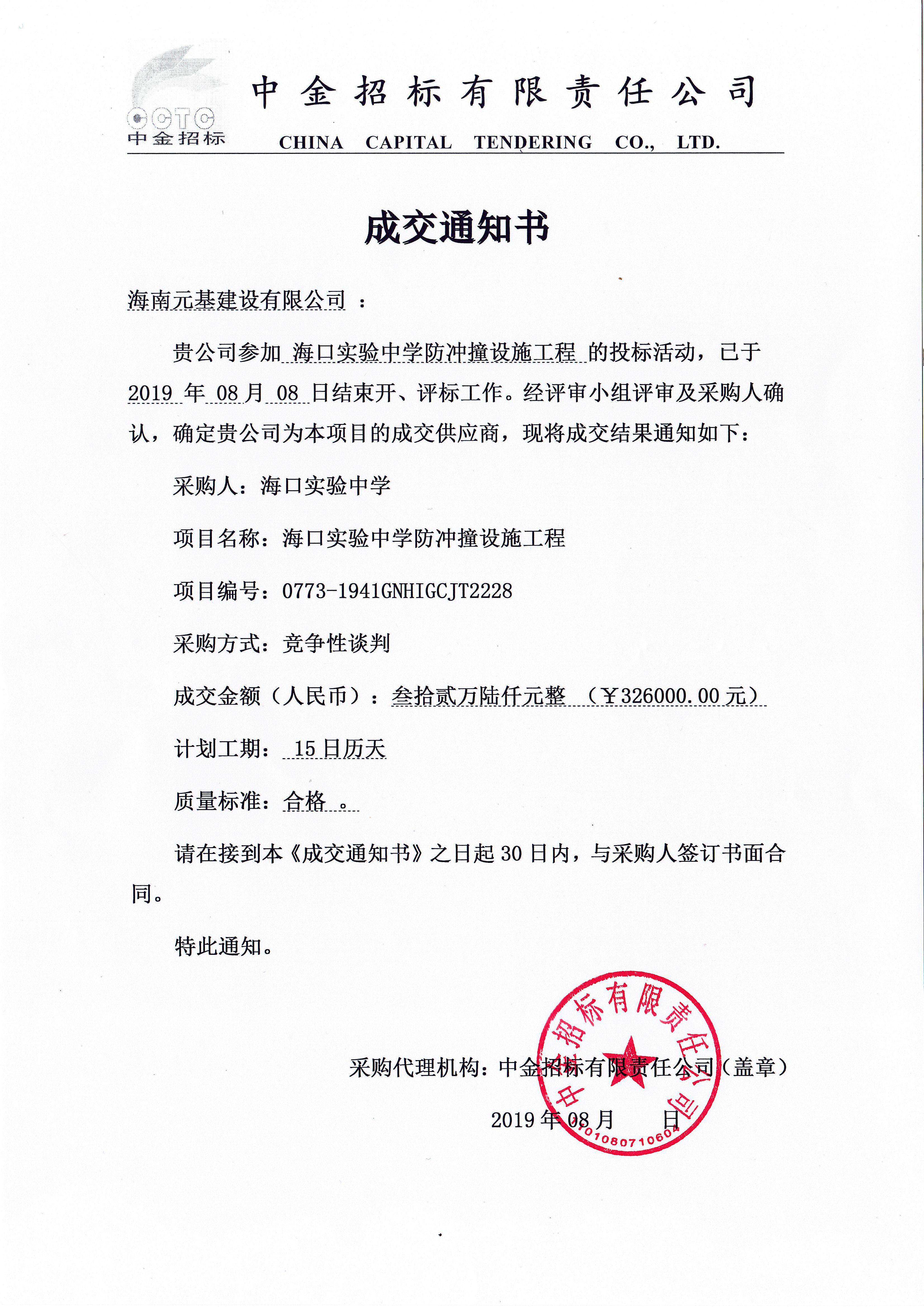 2019年8月8日,海南元基建設有限公司中標??谑袑嶒炛袑W防撞沖設施工程項目,中標金額32600.00元,計劃工期15日歷天,我司于2019年8月6日購買標書,8月7日完成全部投標文件,8月8日在??谑兴{天路12號國機中洋公館2棟601室開標,其評標結果為我司為中標人。