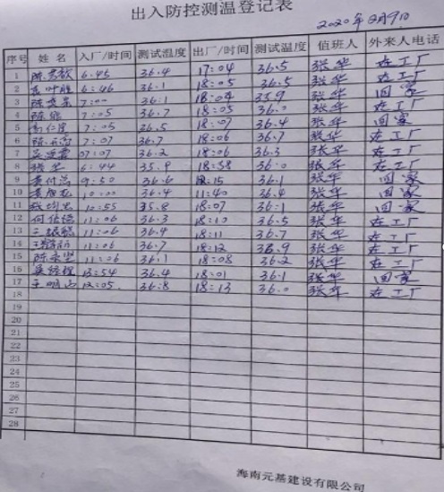 元基公司在返崗復工后,每日在上下班前給每位員工測試