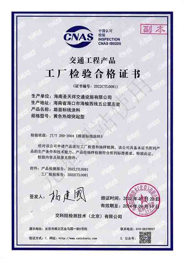 產(chǎn)品合格證書—黃色熱熔突起型